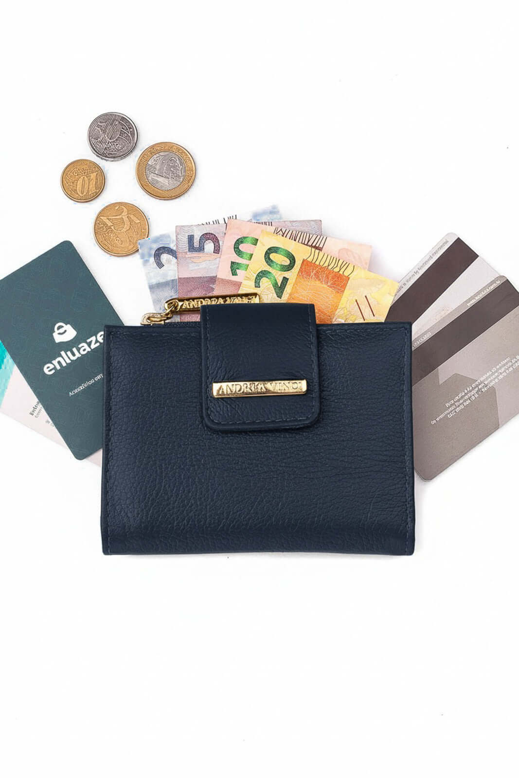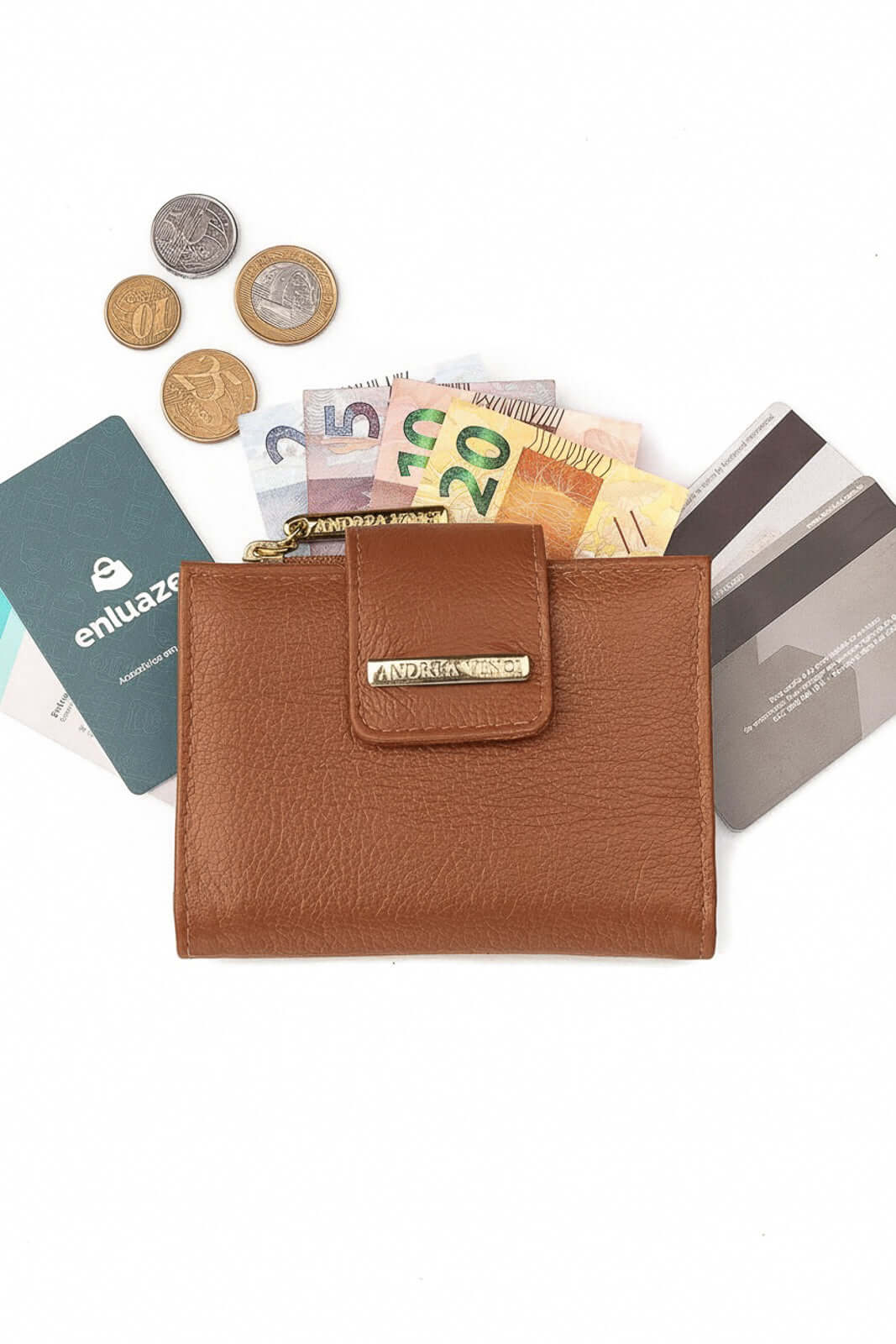 Carteira feminina de tamanho médio/pequeno. É toda fabricada em couro legítimo, e possui uma lapela pequena com botão de pressão para fechamento. Esse modelo comporta vários cartões, documentos (RG e CNH), dinheiro e moedas. Estilosa, compacta, prática e perfeita para o dia a dia de qualquer mulher.
