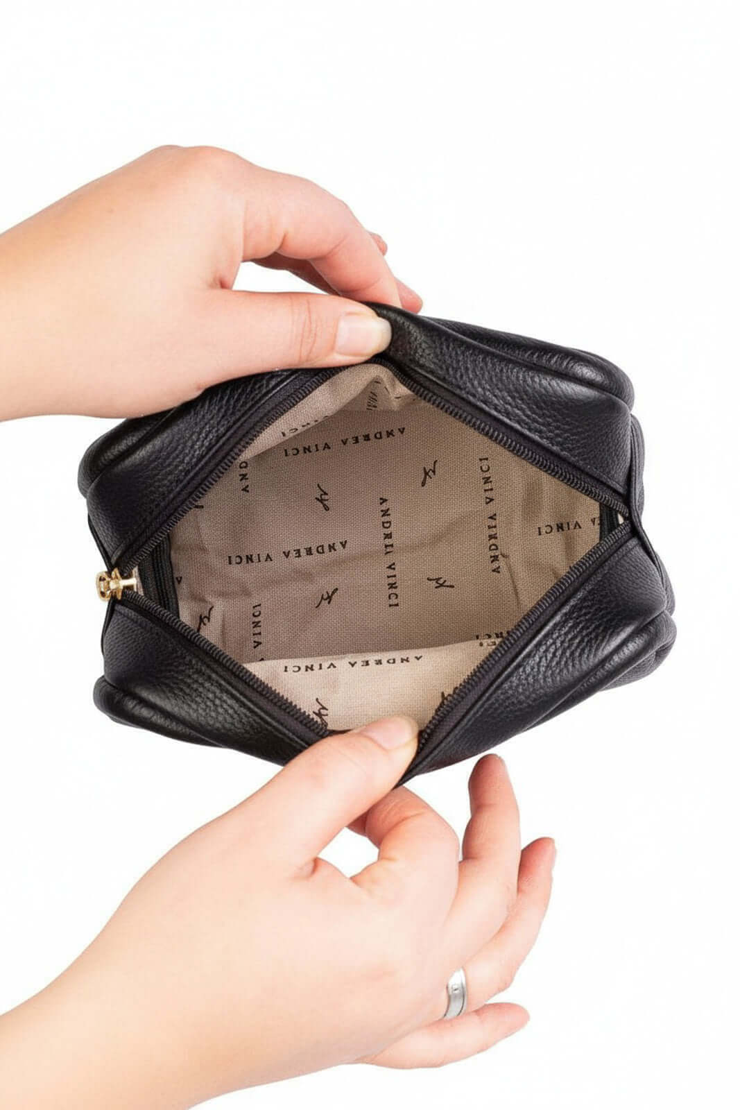 Produzida com couro de alta qualidade e metais dourados, a Necessaire Feminina de Couro Andrea Vinci oferece durabilidade e elegância. Além disso, seu design moderno e sofisticado é ideal para combinar com diferentes estilos e ocasiões.