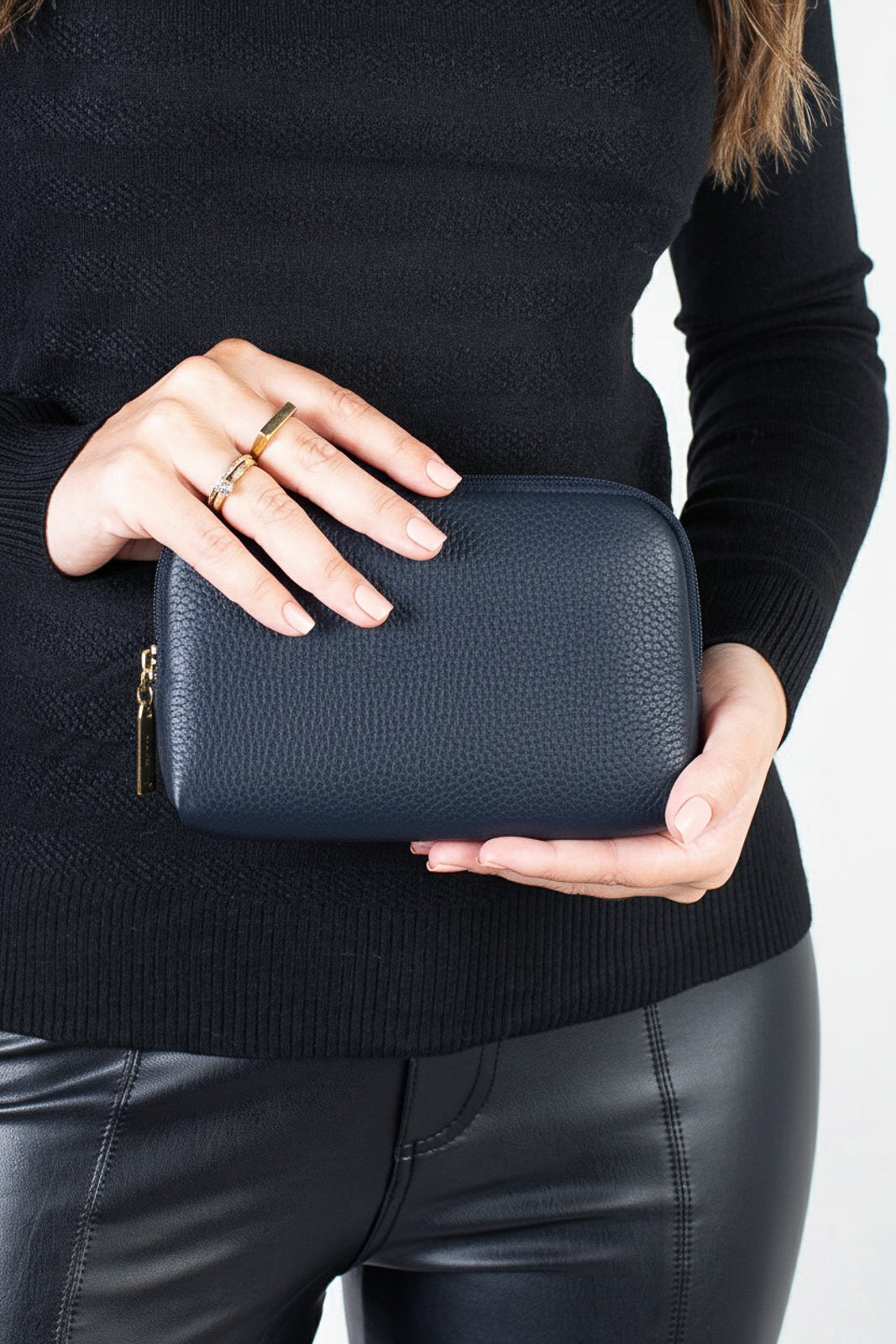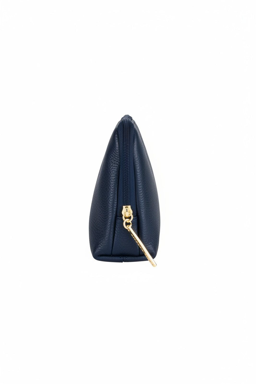 Necessaire feminina de couro de tamanho pequeno com estrutura maleável e metais dourados.