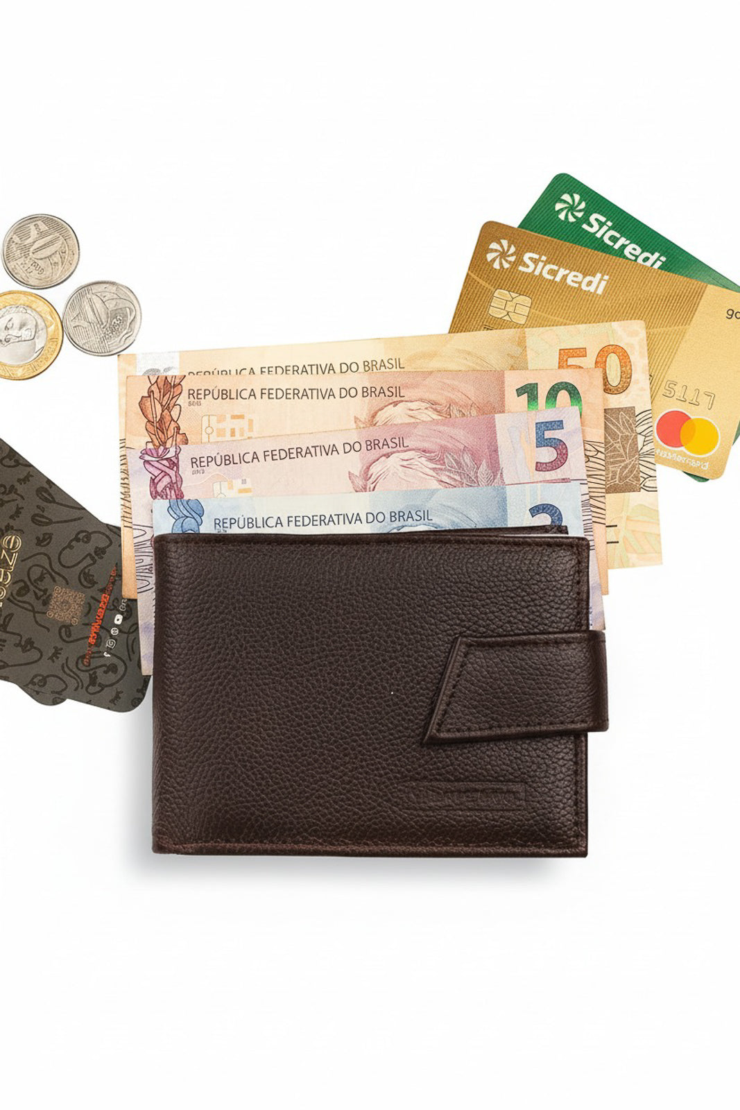 Carteira masculina de couro legítimo com fechamento em botão. Clássica e atemporal, com bastante espaço para cartões, documentos, dinheiro e moedas.