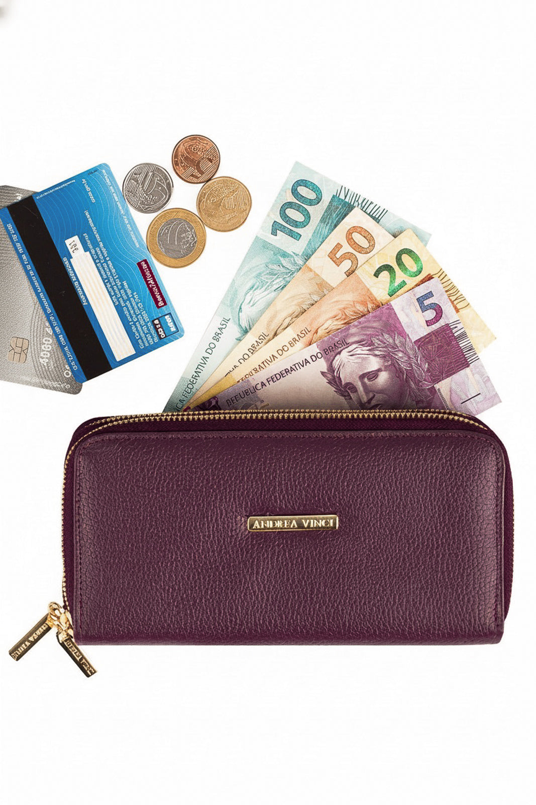 A carteira feminina Tinna é fabricada inteiramente em couro legítimo, possui formato retangular e tamanho grande. Ela possui dois compartimentos com zíperes de metal, ideal para carregar vários cartões e documentos.