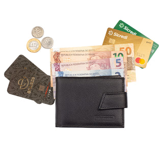 Carteira masculina de couro legítimo com fechamento em botão. Clássica e atemporal, com bastante espaço para cartões, documentos, dinheiro e moedas.