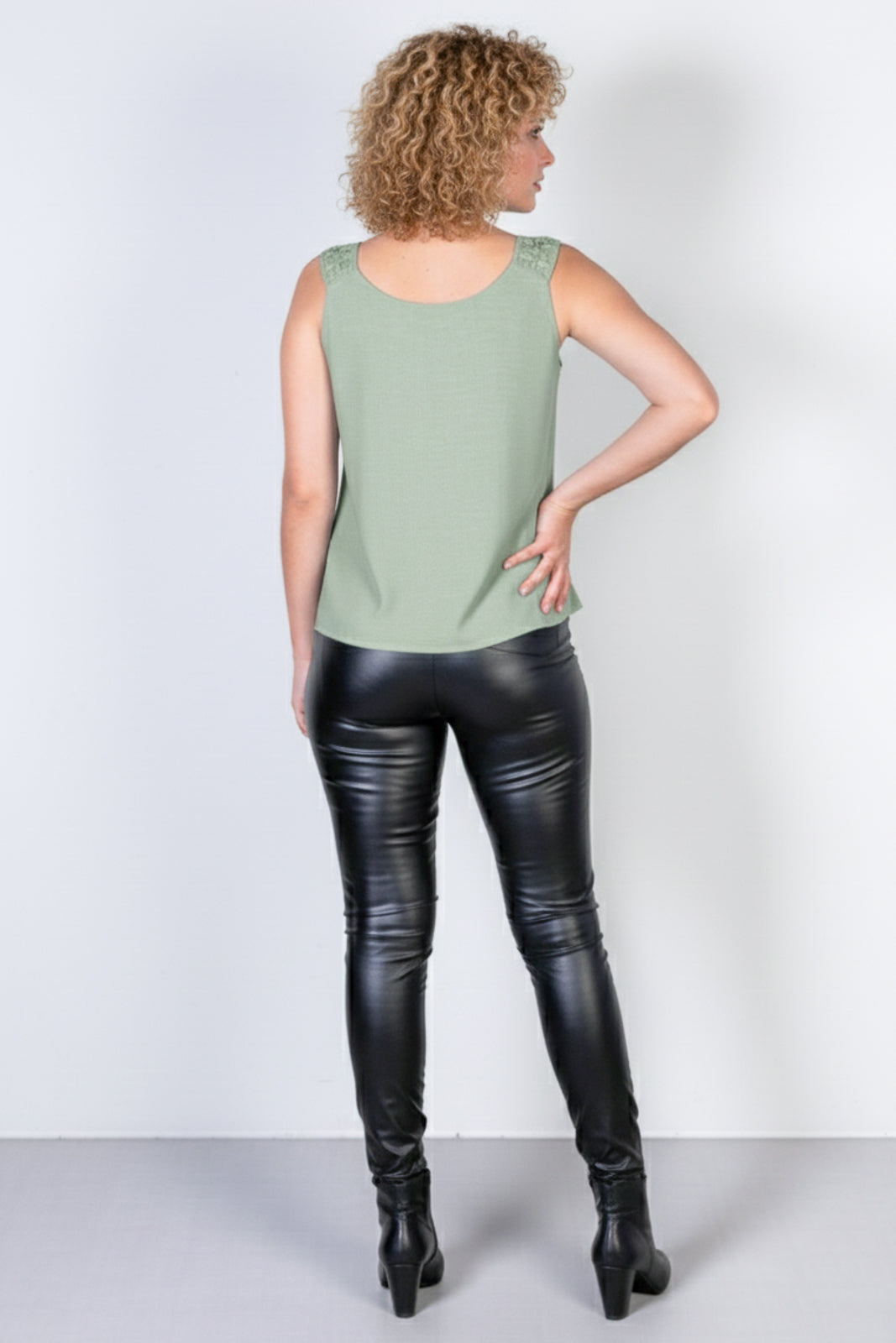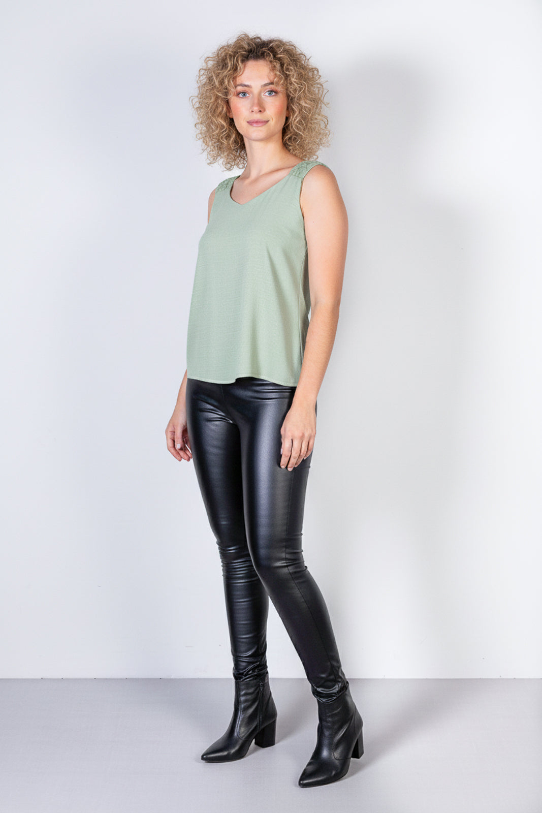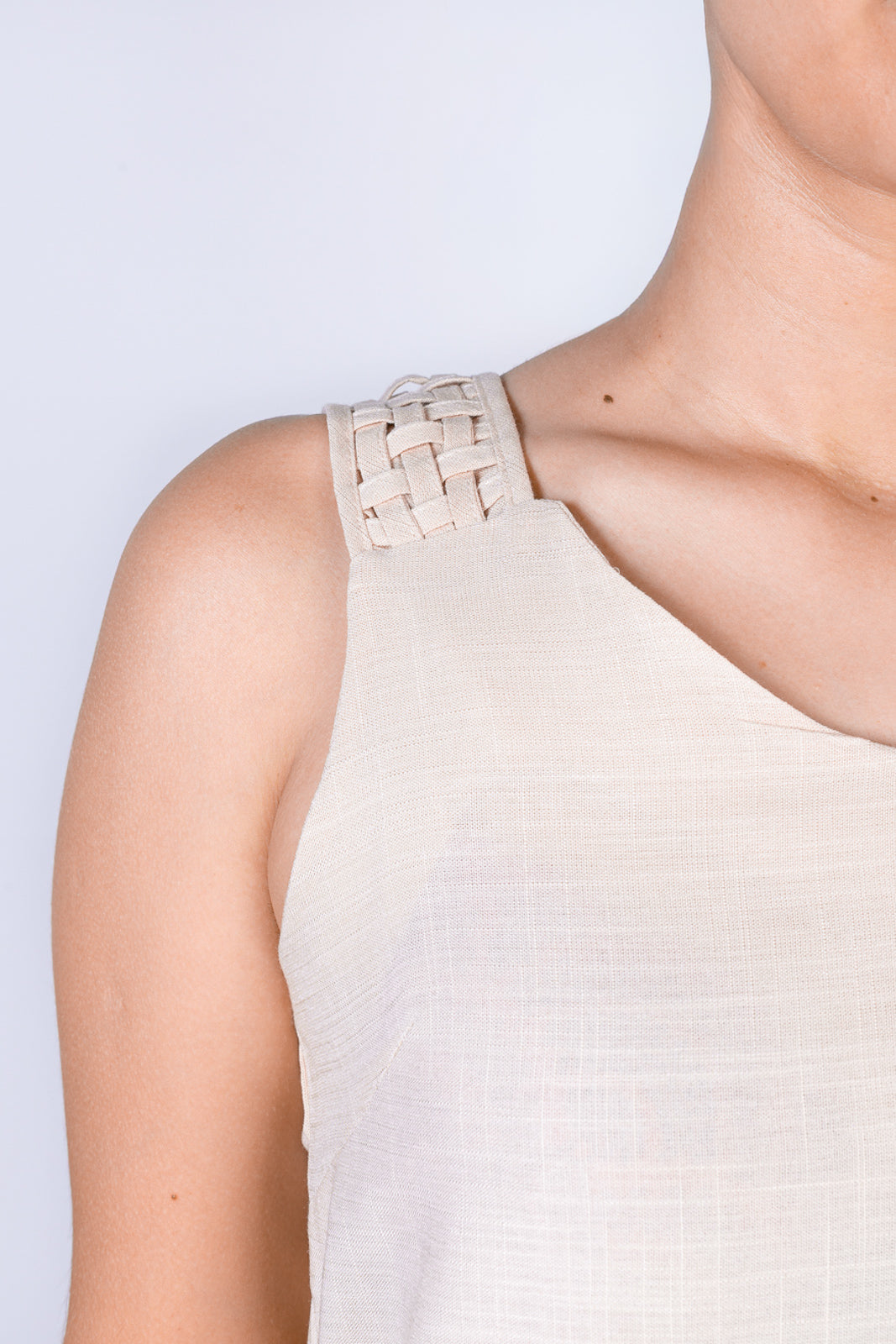 O grande destaque dessa peça está no trabalho artesanal das alças, que apresentam um detalhe trançado sofisticado. Esse acabamento transforma a regata em um item especial, capaz de elevar até as produções mais simples. Além disso, o decote em V traz feminilidade e alonga a silhueta, garantindo equilíbrio entre conforto e estilo.