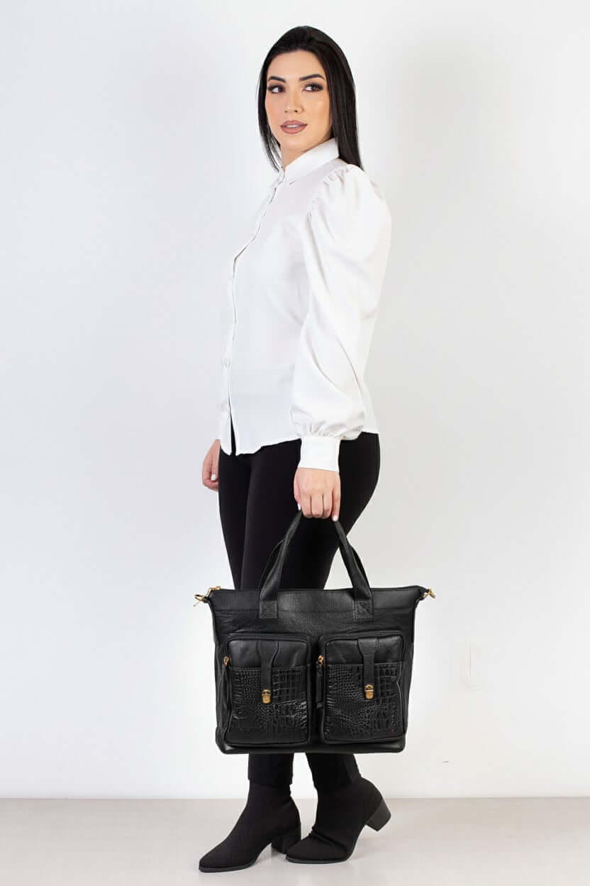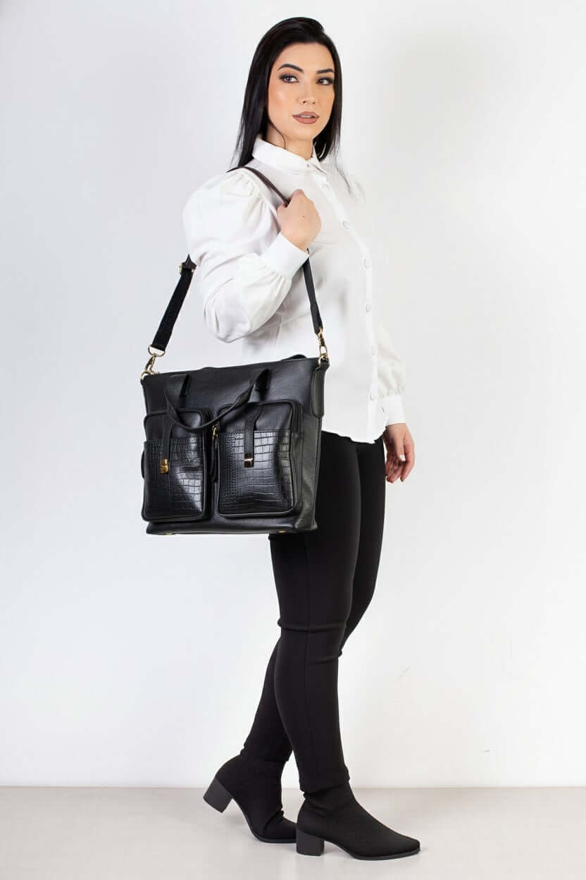 A pasta feminina executiva é confeccionada com couro macio e maleável, oferecendo não apenas um design elegante, mas também durabilidade e conforto. Equipada com alças fixas para ombro, a praticidade é garantida, e ainda acompanha uma alça transversal ajustável conforme sua preferência.