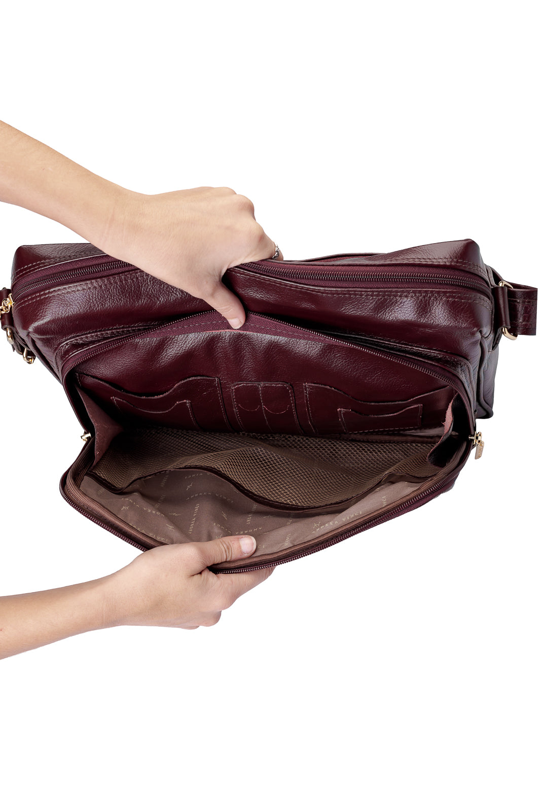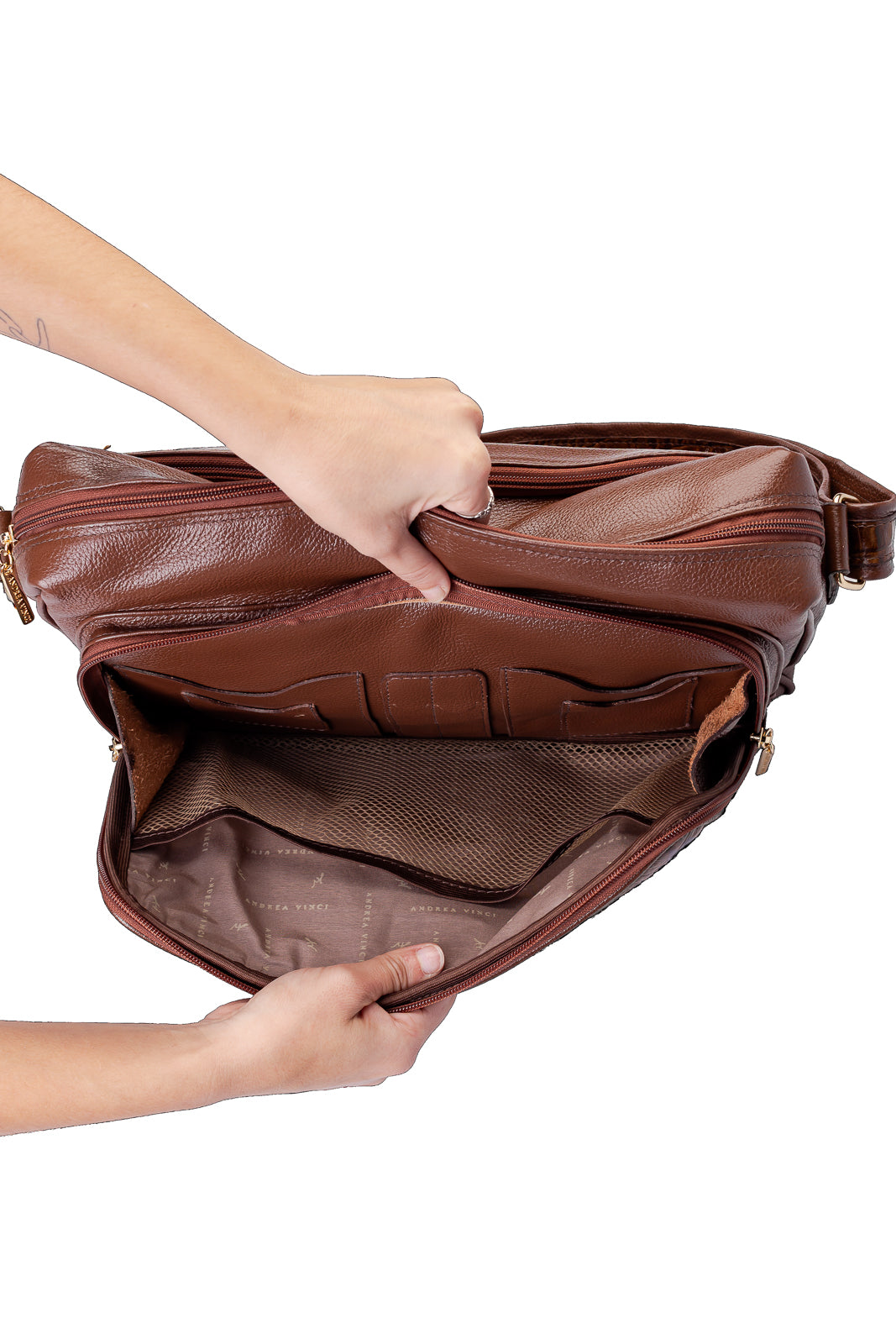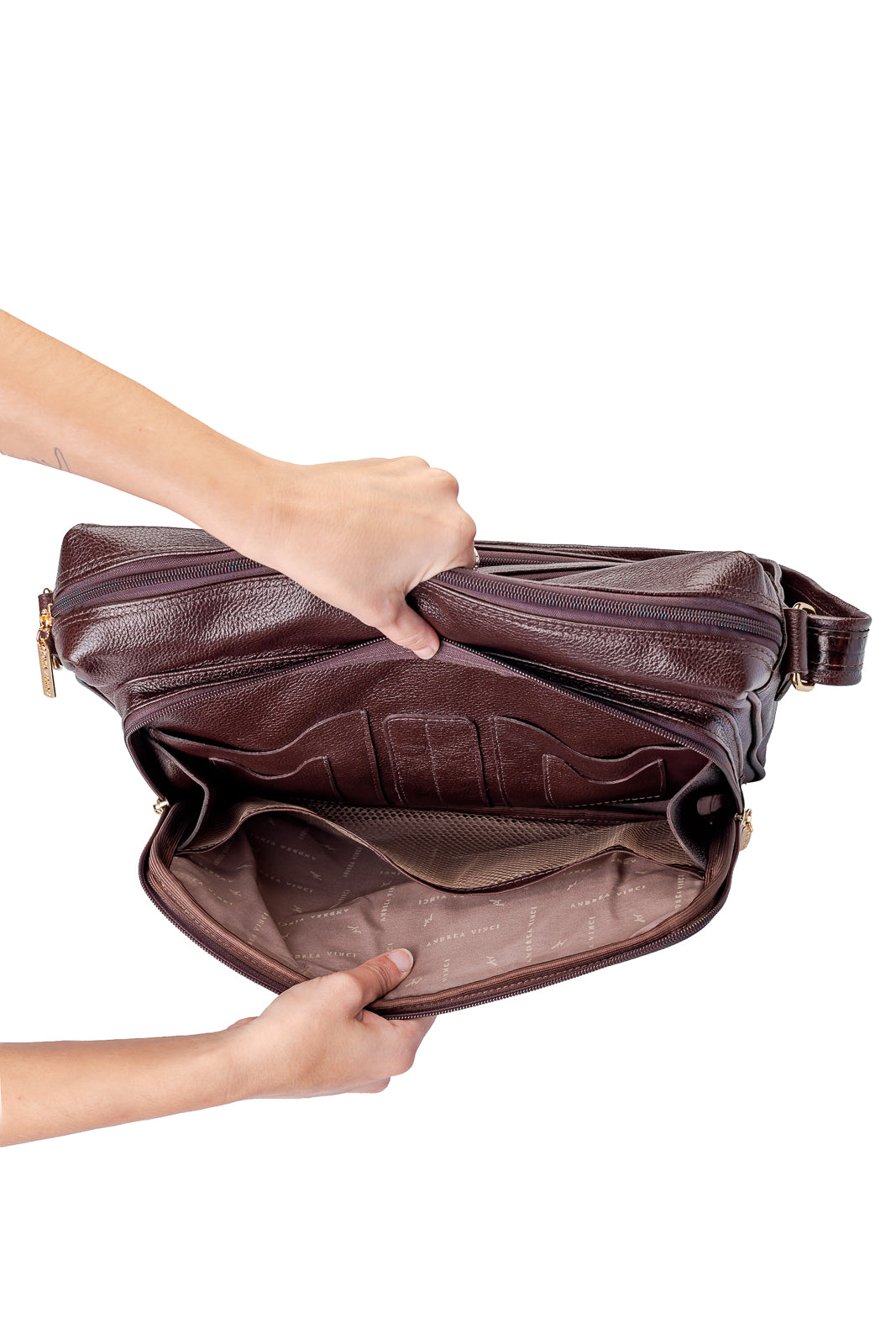 A alça possui couro duplo com costura reforçada para aguentar peso, e a pasta conta com vários compartimentos inteligentes pra deixar tudo em ordem.
