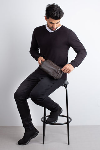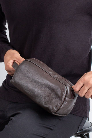 Necessaire de couro de tamanho médio, com uma alça lateral, produzida inteiramente em couro legítimo. Possui bastante espaço interno para carregar os itens essenciais. Pode ser levada em viagens, dentro de mochilas ou pastas, ou mesmo na mão, de forma individual.