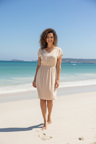 O design valoriza a silhueta de forma natural: o elástico na cintura define delicadamente a região, enquanto o decote em V alonga o colo e traz um toque de feminilidade. As mangas curtas oferecem conforto e praticidade, tornando o modelo ideal para o verão e meia-estação.