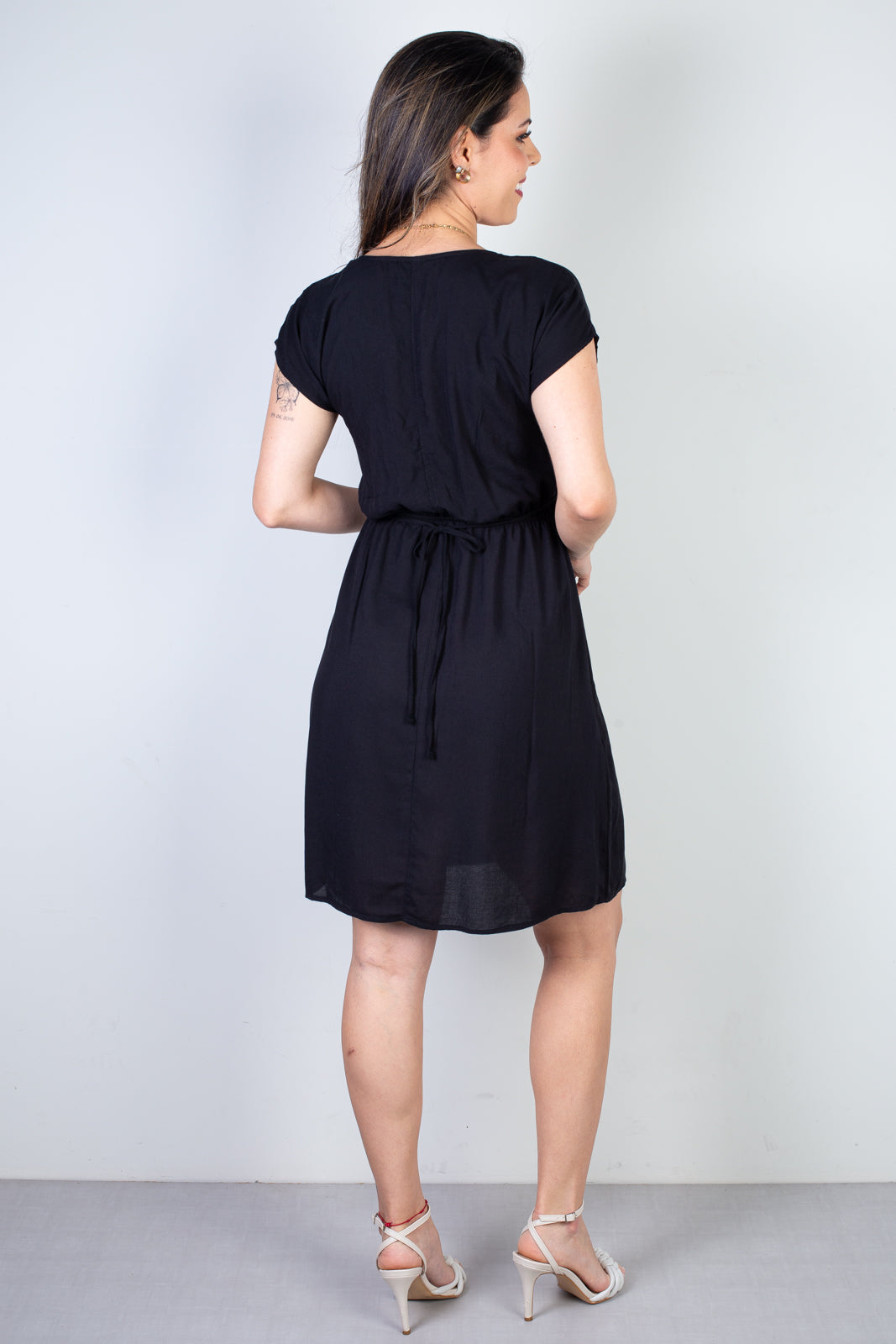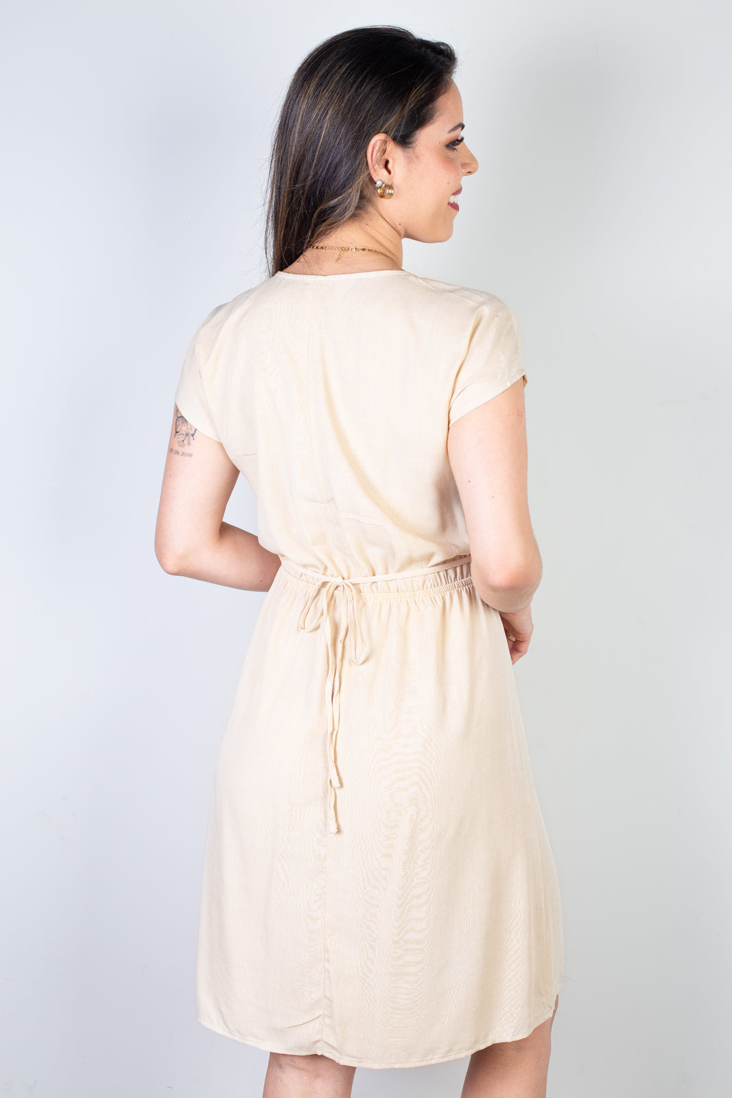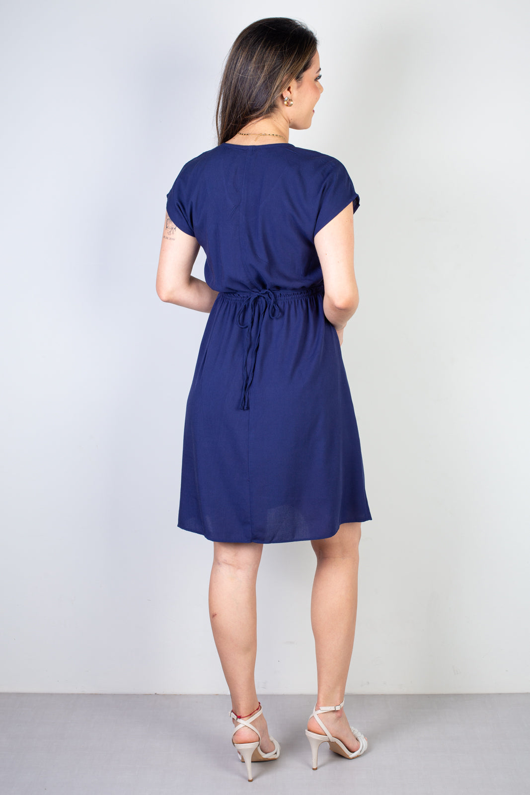 Na parte de trás, o detalhe com fitinha para amarrar garante um charme extra, permitindo ajustar o caimento conforme a preferência. O comprimento acima do joelho traz leveza e jovialidade ao look, perfeito para o uso no dia a dia, passeios ou ocasiões casuais.