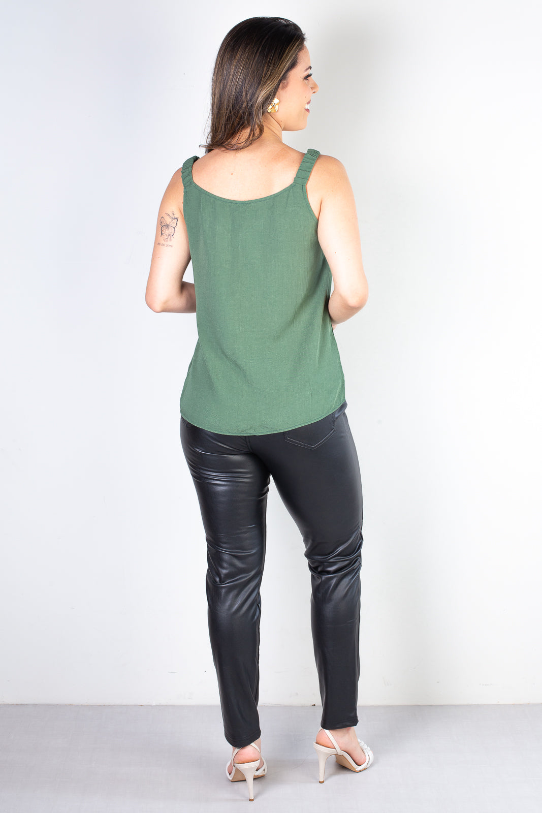 Os detalhes fazem toda a diferença: alças franzidas que deixam o visual mais moderno e botões aparentes que dão o toque final de estilo — mesmo sendo apenas decorativos, eles enriquecem o design com muita personalidade. O tecido leve oferece frescor e mobilidade para o dia inteiro, ideal para quem busca beleza e praticidade em uma única peça.