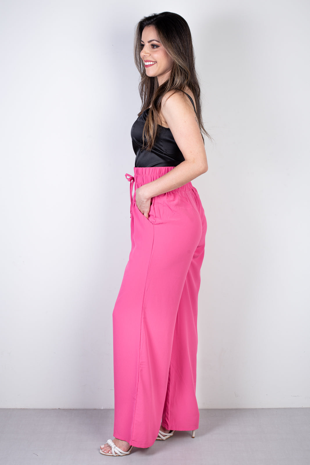 O tecido leve e fluido confere caimento natural, acompanhando o movimento do corpo com suavidade. As pernas amplas no estilo pantalona trazem elegância e liberdade de movimento, ideais tanto para o trabalho quanto para momentos de lazer.