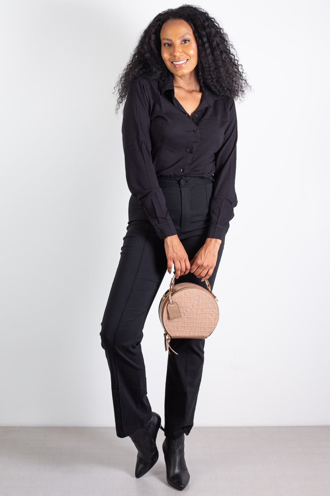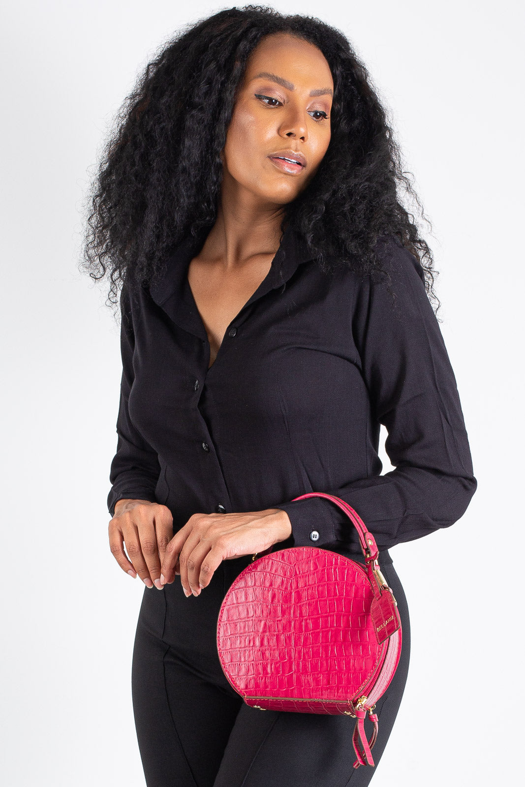 A mini bolsa Renata é fabricada em couro legítimo. Ela possui uma estrutura rígida, em formato redondo, com abertura dos dois lados em zíper. Possui uma alça de mão e uma alça opcional para ser usada no ombro, como tiracolo ou transversal.