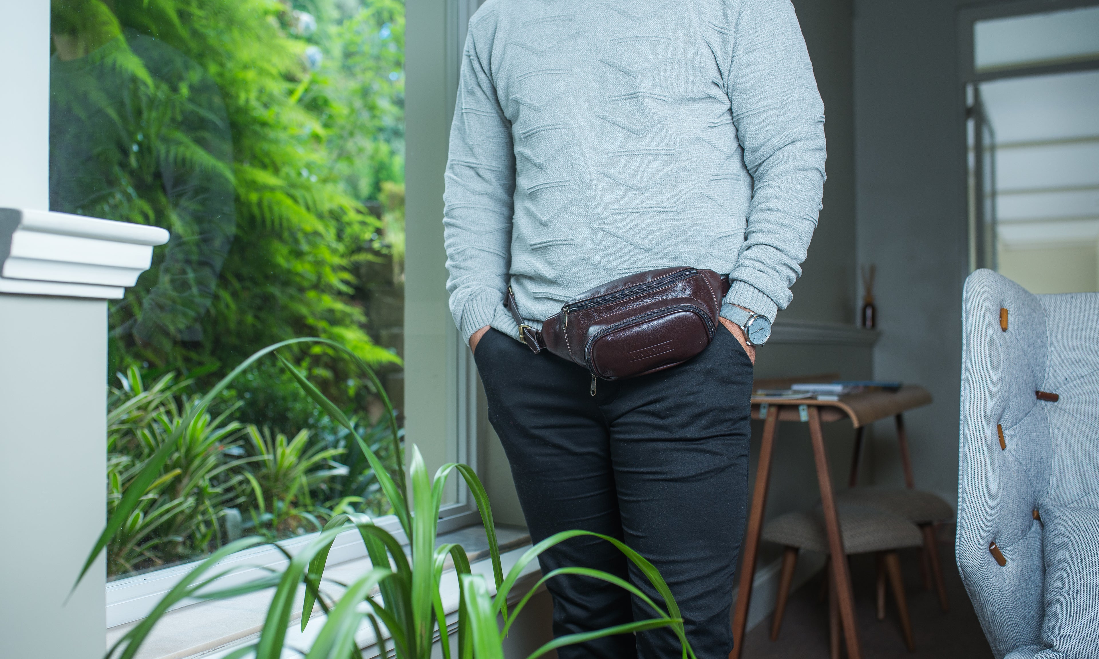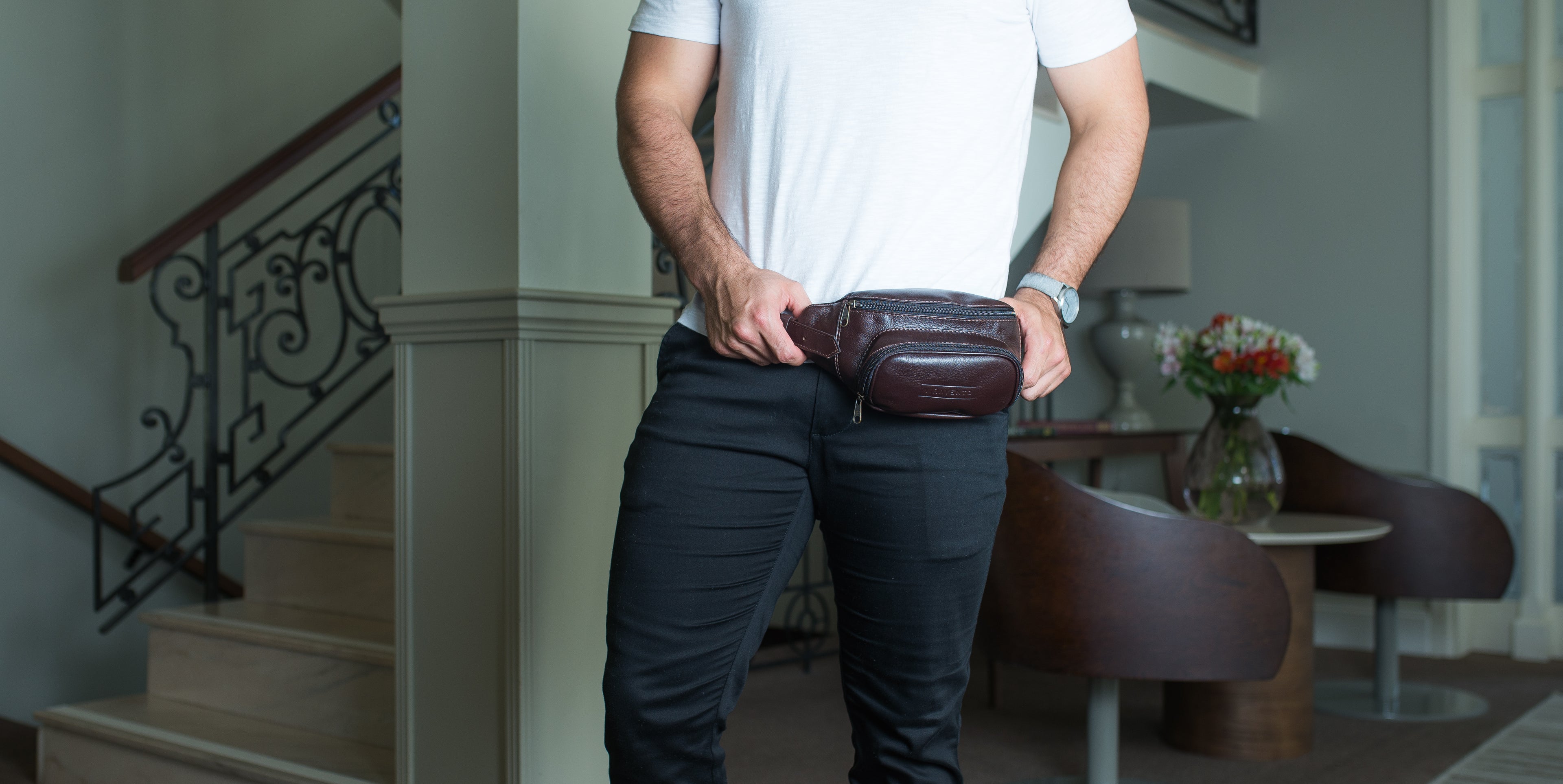 Pochete masculina fabricada em couro legítimo com desenho minimalista e simétrico. Ela possui bastante espaço interno e profundidade, perfeita para quem precisa carregar vários itens pessoais.
