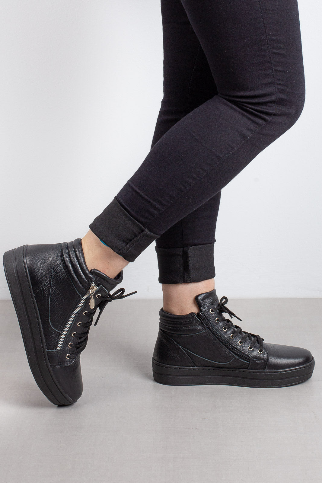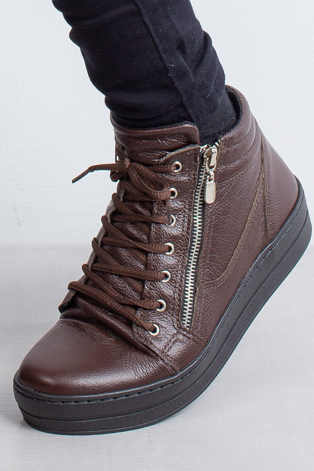 Tênis feminino de cano alto, fabricado em couro legítimo, com sola de borracha e cadarço. Possui zíper dos dois lados e é super confortável, ideal para usar o dia todo. Uma opção estilosa e autêntica, para montar diferentes looks para diversas ocasiões.