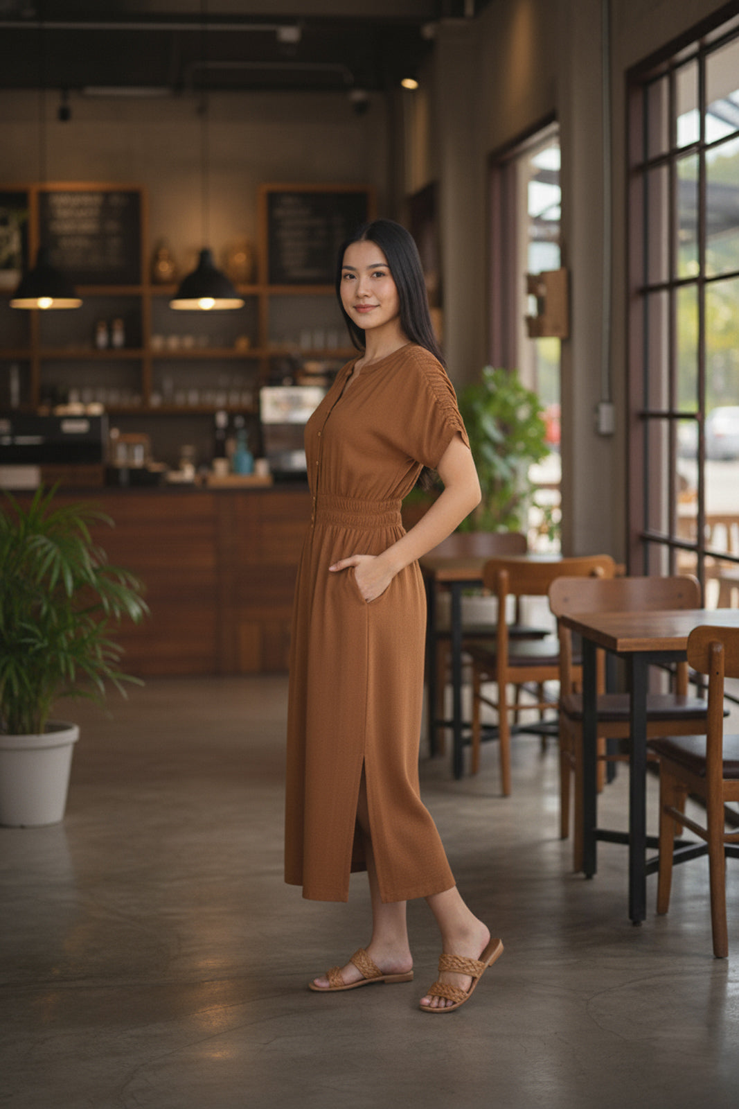 O Vestido Midi 51133 une conforto, leveza e um toque clássico que nunca sai de moda. Feito em tecido leve e fluido, possui botões funcionais por toda a frente, elástico na cintura e mangas curtas com detalhe franzido nos ombros, proporcionando um caimento elegante e natural. O decote arredondado com abertura em gota traz charme discreto, enquanto os bolsos laterais e fenda na barra garantem praticidade e movimento.