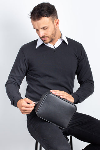 Necessaire Porta Bíblia ou Porta Livros fabricado inteiramente em couro legítimo. Este acessório foi desenvolvido especialmente para que você consiga carregar seus livros de forma segura e protegida, ou seus itens de higiene, usando como uma necessaire. Externamente, há um bolso de zíper. Na parte interna, há outras duas divisórias, uma em cada lado. Além disso, há dois porta canetas e dois pequenos porta objetos para itens pequenos.